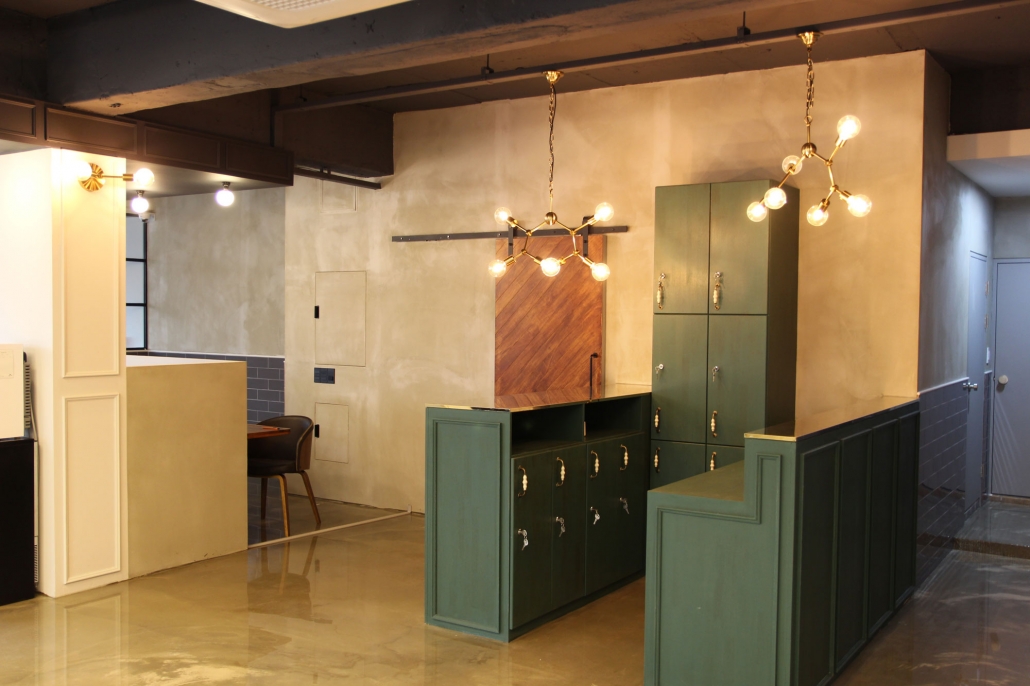 전체적으로 빈티지 모던 느낌을 살리기 위해, 어두운 천정색감에 따스한 빛의 조명을 두어 아늑함을 살리면서 웨인스코팅과 녹색과 골드 컬러의 조화로 세련미를 더하였다.